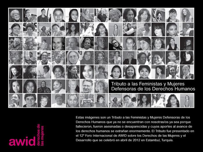 Con su dedicación, su compromiso y su pasión, las defensoras de los derechos humanos han luchado por los derechos, el género y la justicia social generando cambios en muchas de las comunidades en las que arraigaron su trabajo. El Tributo en línea 2015 de AWID a las defensoras de derechos humanos que ya no están con nosotras/os celebra a mujeres con trayectorias muy diversas: activistas, políticas, pacifistas, escritoras, artistas, abogadas, académicas y periodistas. Ellas lucharon por los derechos de las mujeres, las/os trabajadoras/es, los pueblos indígenas, las personas lesbianas, gay, bisexuales, trans*, queer e intersex, la protección de la tierra, los derechos ambientales y de las/os trabajadoras/es sexuales y defendieron esos derechos. También promovieron la justicia en el ámbito jurídico y en el social, así como el derecho a la educación. Su activismo es un testimonio de las luchas colectivas de todos nuestros movimientos sociales. Este Tributo recuerda, celebra y honra el trabajo de las defensoras de derechos humanos que ya no están con nosotras/os.