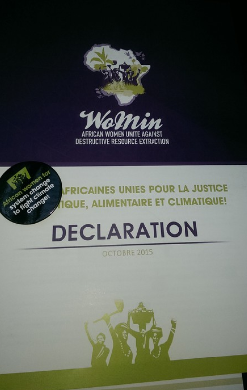 «Un enfoque africano ecofeminista corrige las estrategias capitalismocéntricas y que refuerzan el patriarcado que postulan casi todas las delegaciones de los países que asisten a la COP 21», manifestó WoMin en una declaración sobre las negociaciones de París. En ella, WoMin llega a la conclusión de que: «La lucha contra un paradigma de desarrollo opresivo es, al mismo tiempo y de una sola vez, también una lucha contra el terrorismo, la militarización, el racismo y la guerra. Como mujeres africanas, esa es nuestra lucha; es una lucha por la justicia, la paz, la solidaridad y el amor en todo el mundo.»