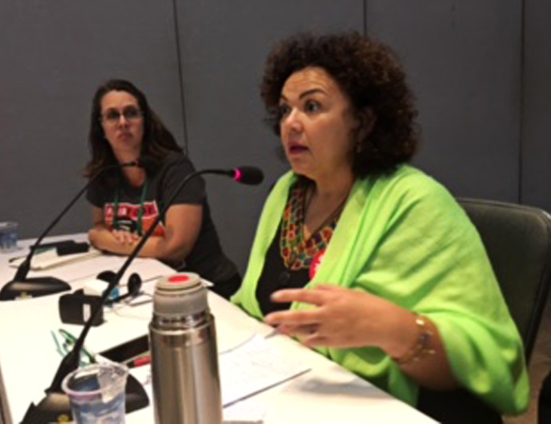 Con el apoyo de una intérprete, Junéia Batista, secretaria nacional de la Central Única de los Trabajadores (CUT) de Brasil, habló sobre cómo la Central está alentando a las mujeres a hablar de violencia en el lugar de trabajo pues es «difícil denunciar el acoso, es difícil obtener las pruebas de un acoso».