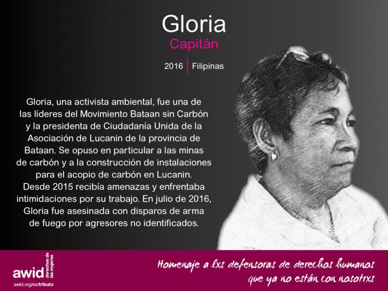 En seguida, en 2016, Capitan pasó a recibir visitas amenazantes de hombres no identificados, advirtiéndole que dejara de organizar sus actividades contra el carbón o sufriera las consecuencias. Rachazó hacerlo. En julio de ese año, Gloria Capitan, madre de cinco hijos y abuela de 18, propietaria de un bar karaoke en la carretera, fue asesinada con disparos letales por agresores no identificados frente a sus nietxs y en su lugar de trabajo.