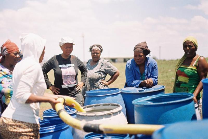 Les femmes de Somkhele remplissent des barils d’eau d’un « waterkan »—une source municipale qui déssert les communautés de manière irrégulière. Les waterkans constituent la source primaire d’eau pour des dizaines de milliers de résident-e-s ruraux qui vivent dans des conditions de sécheresse.