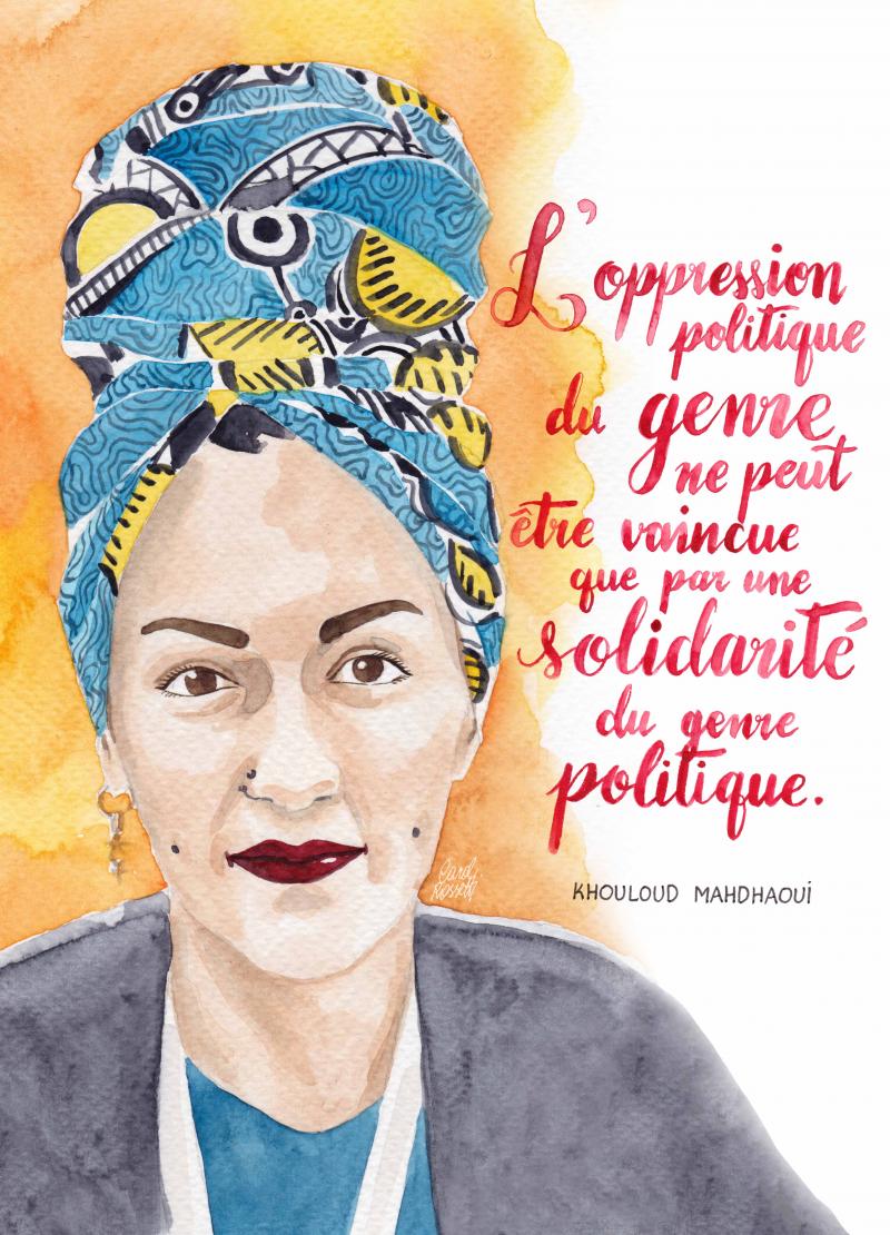 Khouloud Mahdhaoui est la présidente de Chouf, une organisation féministe tunisienne qui a lancé en 2014 le projet appelé Choufthouhonna, le festival international d’art féministe de Tunis. Choufthouhonna est une réponse au manque d’espaces publics qui permettent aux femmes de s’exprimer, un problème lié à la prédominance des discours fondamentalistes dans la Tunisie postrévolutionnaire. Selon Khouloud, le festival d’art remet en cause la domination fondamentaliste en « ouvrant les rues aux voix et aux corps des femmes ». La citation de Khouloud met en exergue l’idée que seul un mouvement politique de solidarité entre ceux et celles qui vivent l’oppression fondée sur le genre pourra venir à bout de ladite oppression. Selon Khouloud, les féminismes inclusifs et divers incarnées par Chouftouhonna sont emblématiques de sa vision d’un avenir féministe : « un monde dans lequel tous et toutes pourront être différent-e-s tout en étant égaux-ales, uni-e-s dans l’amour. »