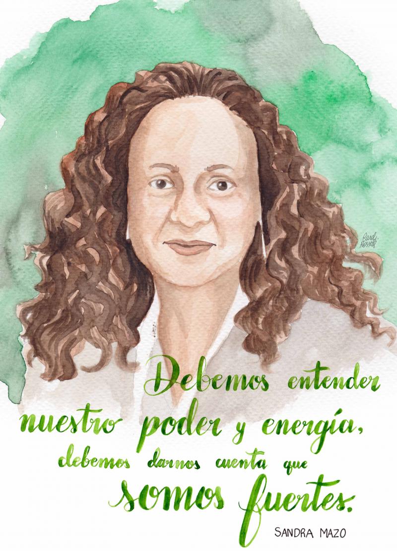 Católicas por el Derecho a Decidir - Colombia (Catholiques pour le droit de décider - Colombie), l’organisation au sein de laquelle travaille Sandra Mazo, mène une campagne pour l'instauration d'un état séculier en Colombie et dans toute l’Amérique latine. La campagne de CDD-Colombie exprime les vues des femmes catholiques qui ne se sentent pas représentées par les opinions catholiques orthodoxes et n’acceptent pas le fait que l’Église impose sa vision dans les politiques de l’État. Les vidéos de la campagne ont permis à la population de comprendre le véritable sens du sécularisme et l’espoir qui lui est associé de créer une société démocratique dans laquelle les droits des personnes sont garantis. À propos de la régression à laquelle les femmes activistes des droits sont confrontées, Sandra voit l’aspect positif de la situation et pense que ce retour en arrière est la preuve des succès du féminisme. La citation choisie pour ce portrait est le reflet de cette manière de penser.