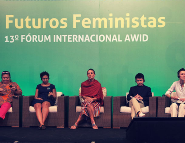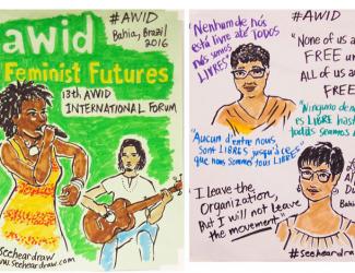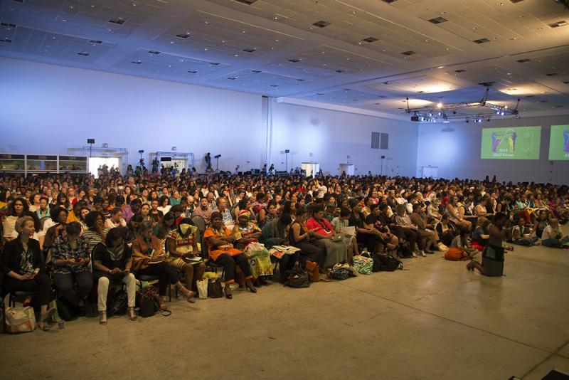 Le « voilà » de cette réponse renvoie à la salle comble de la plénière inaugurale où guérisseuses, activistes, chercheuses, conteuses, diseuses de vérité et autres grandes prêtresses se sont réunies à l’occasion du 13ème Forum international de l’AWID qui se tient à Bahia, au Brésil.