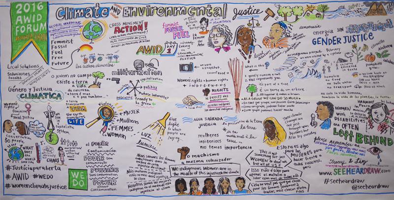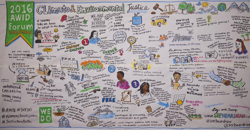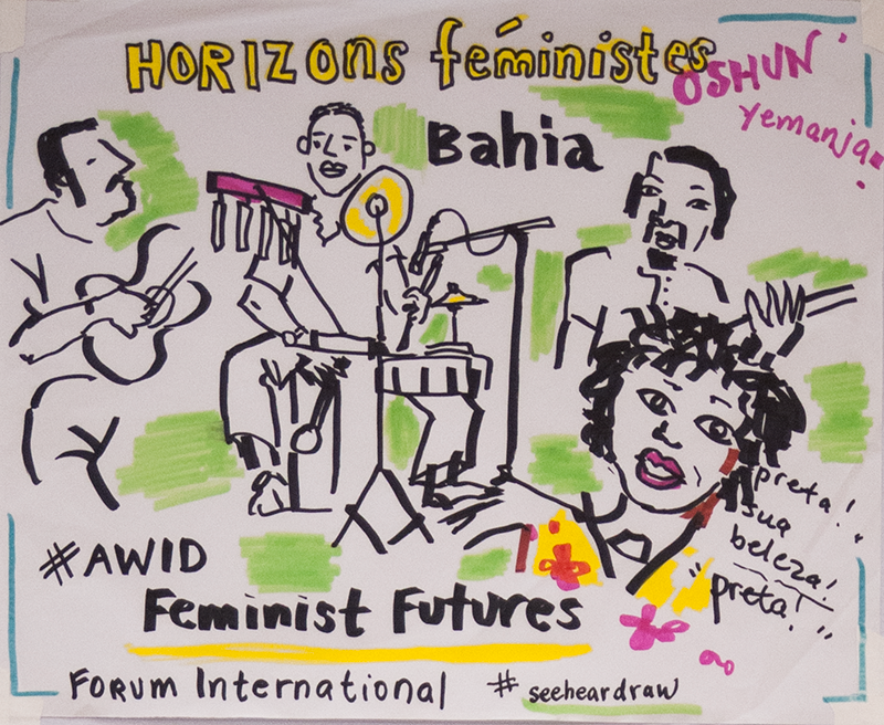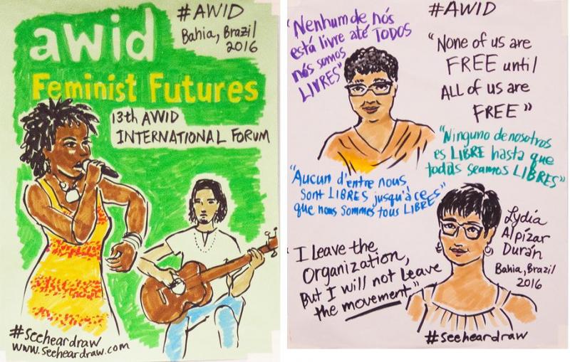 Le Forum de l'AWID se capture avec des mots, des photos et des illustrations. Les images ci-dessous ont été réalisées par Tracey et Liz de SeeHearDraw. Elles interprètent en illustration le riche contenu partagé par nos contributeurs-trices et les participant-e-s lors des séances plénières et différentes discussions du Forum.