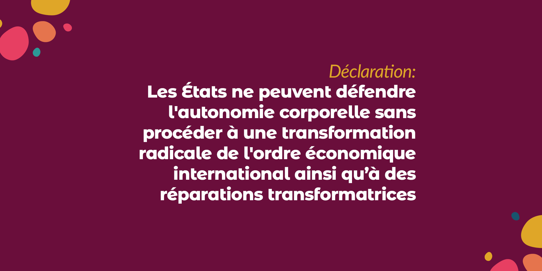 Nous réitérons notre appel aux États pour qu'ils garantissent les conditions matérielles nécessaires à la jouissance de l'autonomie corporelle pour tou·te·s. Tant qu’il ne s’accompagnera pas d’une transformation radicale de notre ordre économique international ni de réparations transformatrices, le soutien des États à l'égalité des genres et à l'autonomie corporelle ne restera qu'un vœu pieux.