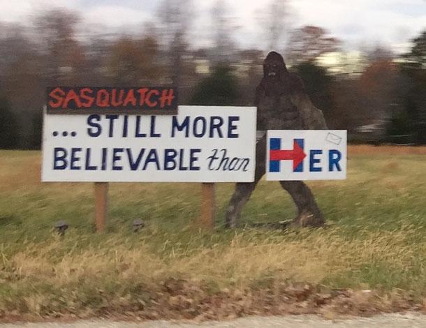 Durant la période pré-électorale, j’ai vu peu d’affiches de campagne dans les jardins de mes voisins : J'en ai aperçu deux pour Ted Cruz, une pour Donald Trump et une pour Bernie Sanders. Durant la semaine précédant les élections, une gigantesque découpe du Bigfoot est apparue pas loin de mon bureau de vote avec les mots « Still more believable than her » (plus crédible qu'elle), le H du mot ‘Her’ étant semblable au logo de la campagne de Hillary Clinton. A la fermeture des bureaux de vote, je n’imaginais toujours pas que Trump puisse être élu au plus haut poste du pays. Jusqu'à ce qu'il le soit.