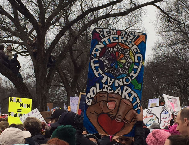 Le soir de la marche, je me suis mise à l'écoute de l’assemblée publique des femmes (National Women’s Town Hall), rencontre organisée par un comité organisateur large et diversifié, au départ de l'initiative « Our 100», qui a recueilli des promesses de soutien aux femmes leaders de couleur dans leurs actions à venir. Les intervenantes ont témoigné des nombreuses menaces de la nouvelle administration Trump auxquelles les femmes sont confrontées. Elles ont présenté les stratégies qu'elles privilégieront et ont souligné l'urgence d'établir un « réseau de connexions entre tous nos mouvements pour échanger sur tous les enjeux concernés ». L’attention a surtout porté sur la question de l’intersectionnalité et sur les priorités d’actions à mettre en place pour aider les femmes à s'organiser en faveur des droits humains partout dans le pays. En effet, ces derniers jours, nous avons constaté une vague de mobilisation autour de la protestation contre le décret anti-immigration scandaleux de Trump. Cette mobilisation nous inspire à devenir « ingouvernable », à refuser la normalisation de politiques discriminatoires et à défendre les valeurs qui nous sont chères.