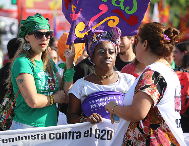 Feminist mobilization against the G20 in Buenos Aires, Argentina, was a powerful moment of resistance to destructive neoliberal agendas promoted by the world’s richest governments, international financial institutions, and transnational corporations. In the Feminist Economics School, participants from across the world came together to reclaim knowledge in the interest of social and gender justice. In popular tribunals organized by the Forum, indigenous, Black and migrant women gave public testimonies on the patriarchal and racist crimes systematically committed by states and financial institutions.