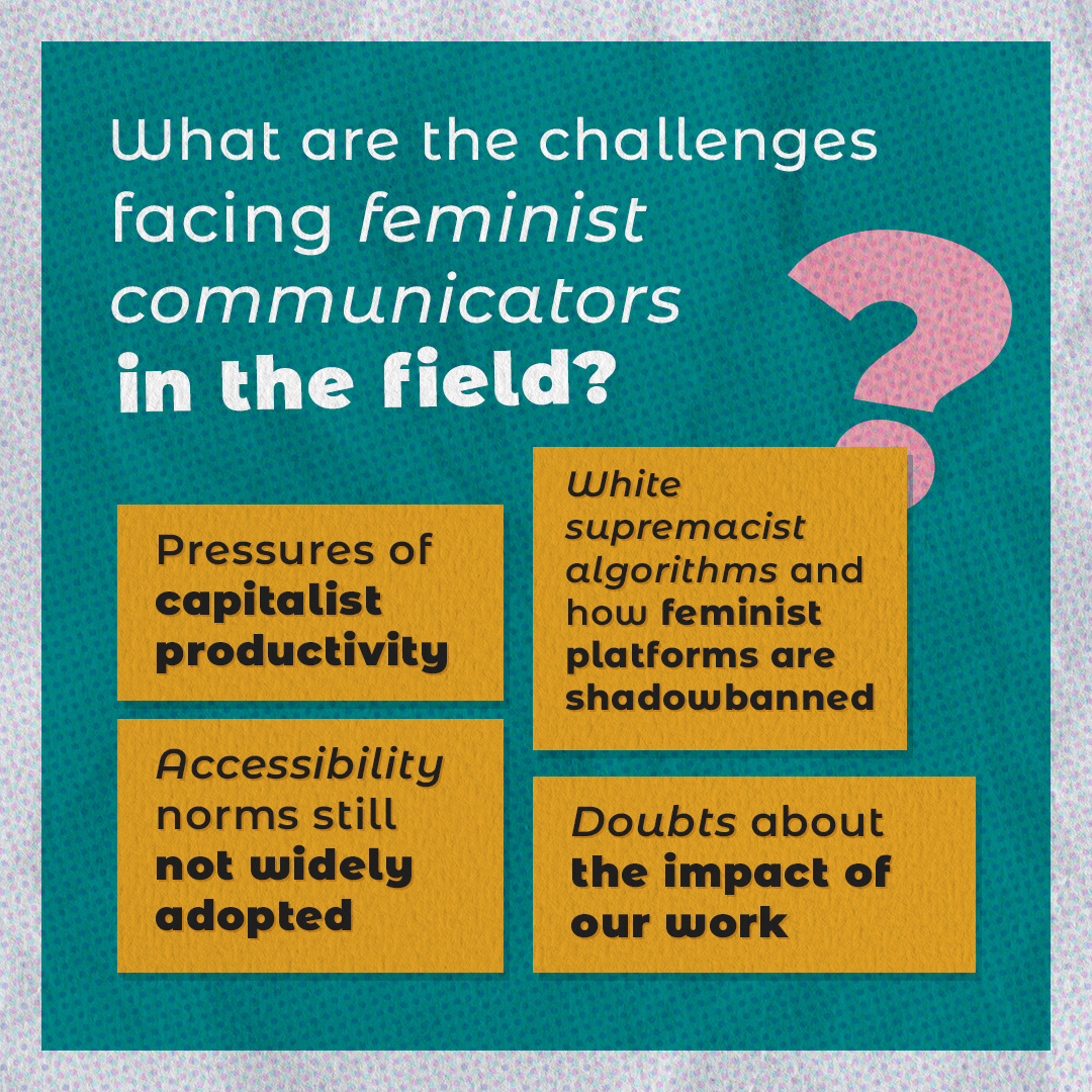 So, as feminists who are concerned with changing behavior in a way that resists and dismantles and upsets patriarchy, capitalism, and racism, how can we use communication to our ends? How can we not just communicate feminist messages, but also use communications in a feminist way? What are the challenges facing feminist communicators in the field?