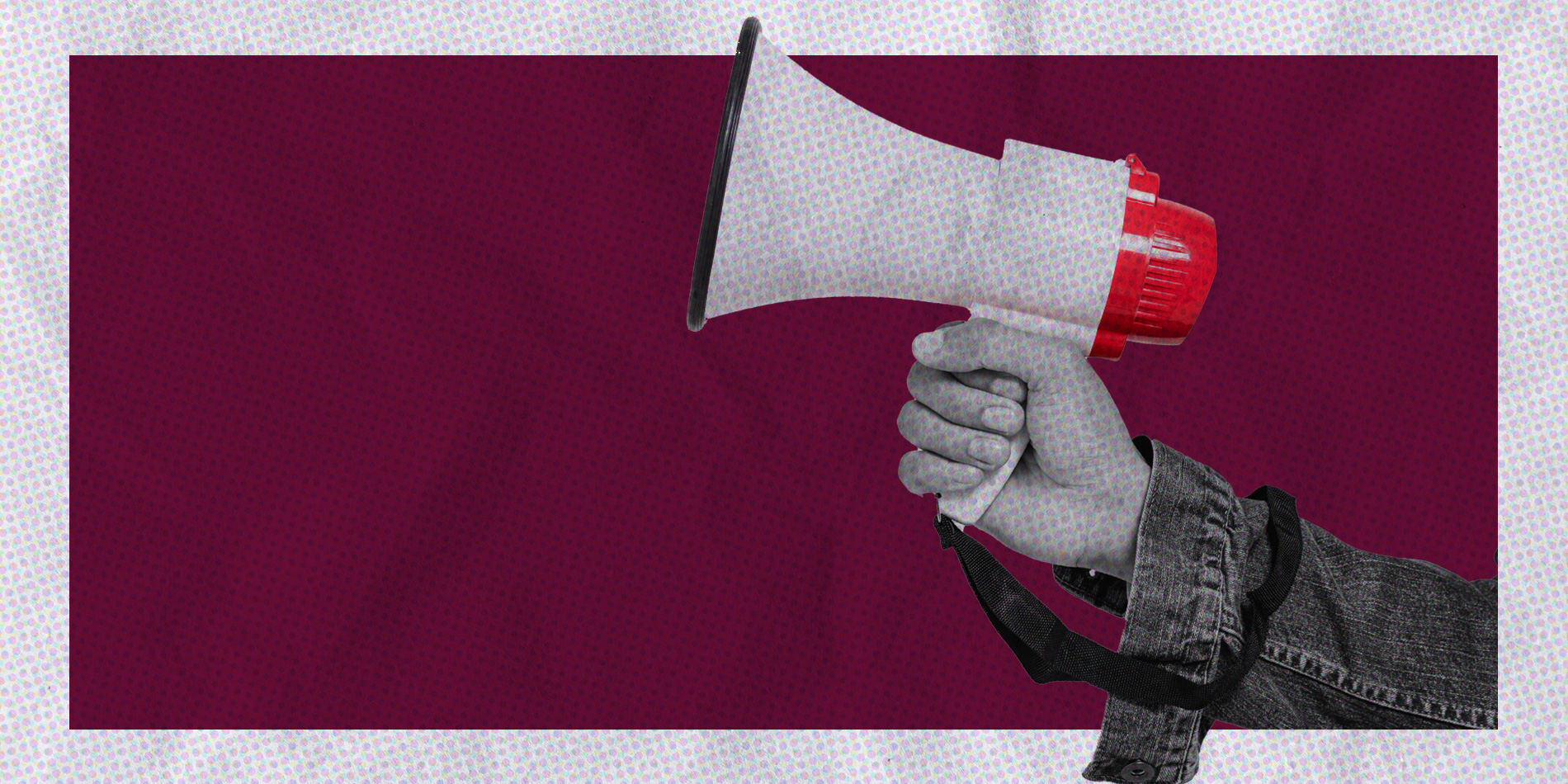 Hand holding a megaphone. The holder wears a denim jacket. The image has a paper and old-style comic texture over it.