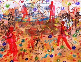 The situation in Kashmir is as they are into the middle of the stories- (in Medias res), their existence seems to be at a pressure cooker point. The absurd theatre of war never ceases and fractures their existence to a paralytic end. The skeletons and fragments which recur in the paintings also undo the eroticism attached to the violence and death which I feel is very masculine in its manifestations. Though I use fragmented body parts it’s either desexualised as a design or through the particular way of rendering, it becomes a sign representing the message of resistance and struggle. The skeletons in the landscapes occupy the same plane of living bodies. This creates a sense of discomfort for we are made aware constantly of the looming death simultaneously.