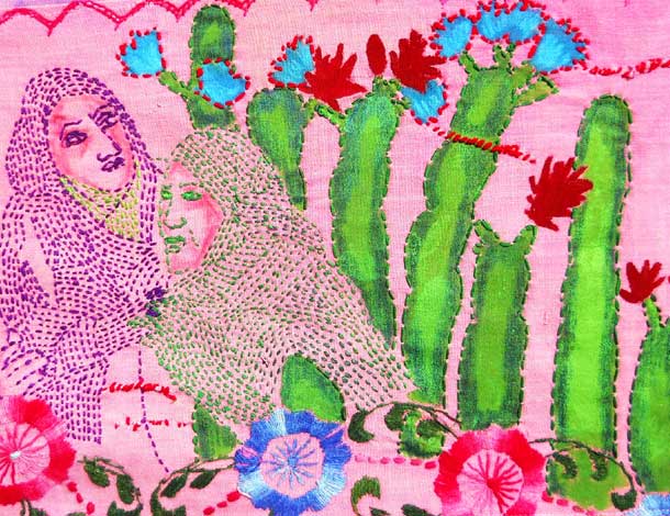 The embroidery works were inspired by the brilliant Kashmiri designs. This was an attempt to translate the designs which I was doing on paper in a more tangible medium. I have used the bedsheets and cut them into small pieces which already had embroidery done over it. For me the bedsheet was more symbolic as it is something which is used very close to the body. As a covering it can mean warmth, love, security, love, passion, longingness, body…etc. Most of the images which I have done in these embroideries are about women. The thread commonly associated with the feminine acts in many ways in these works.
