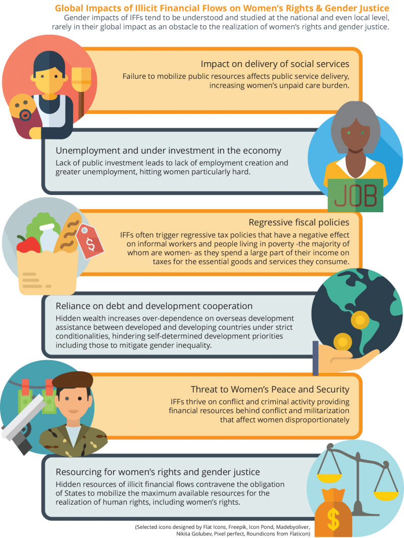 - The basic concept of illicit financial flows (IFFs) and their disproportional gender impact, in relation to the drain in developing countries of critical resources, for the advancement of women’s human rights