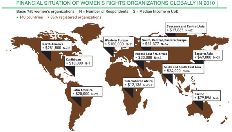 • The current spotlight on women and girls has had relatively little impact on improving the funding situation for a large majority of women’s organizations around the world. In 2010, the median annual income of over 740 women’s organizations around the world was USD 20,000.